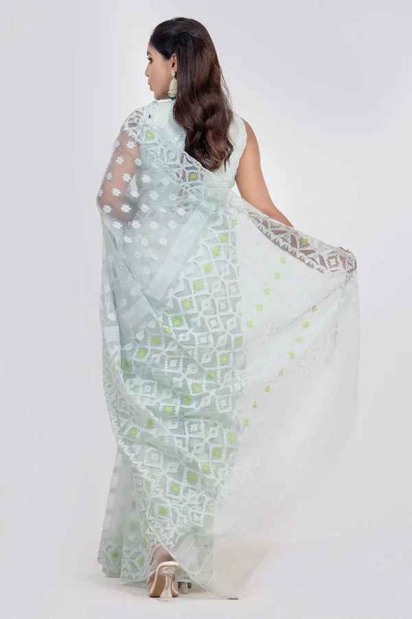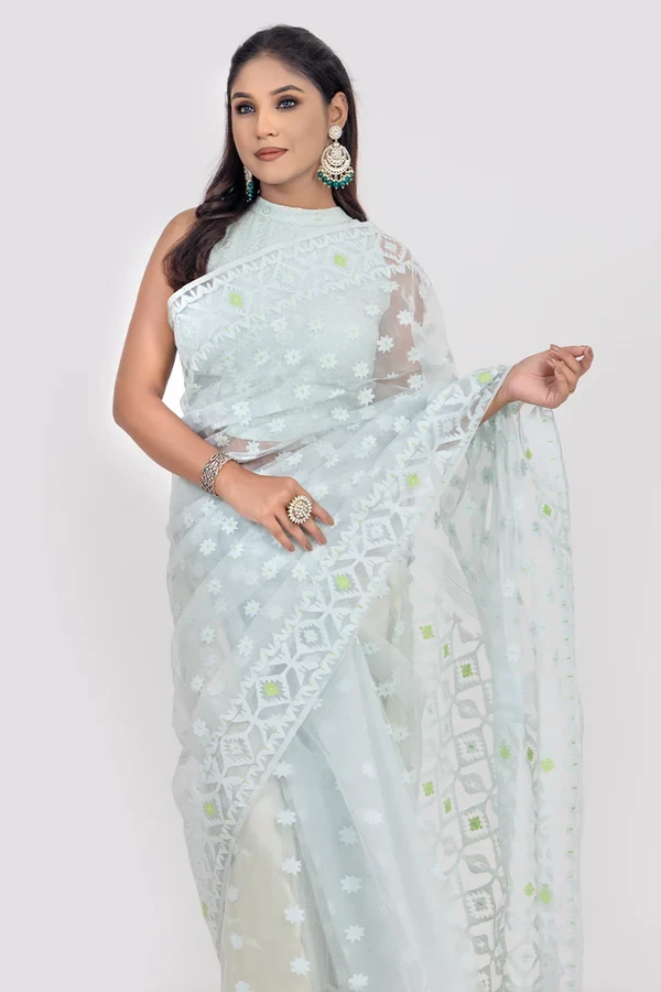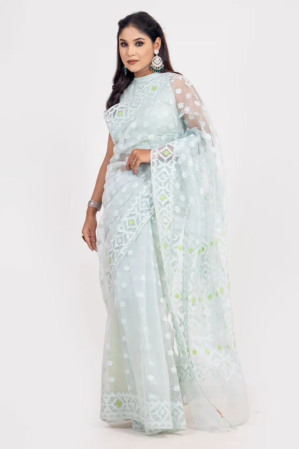 The Regal Jamdani Saree is a half-silk beauty, adorned with a mesmerizing 84-count weave in a masterfully chosen 'Light Mint' color. This exquisite...
