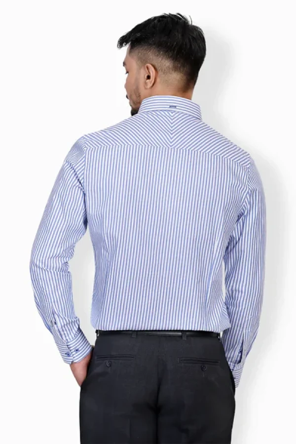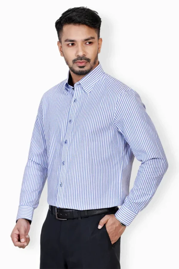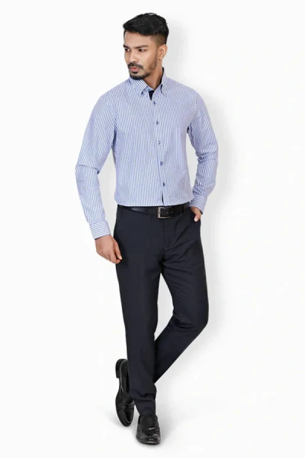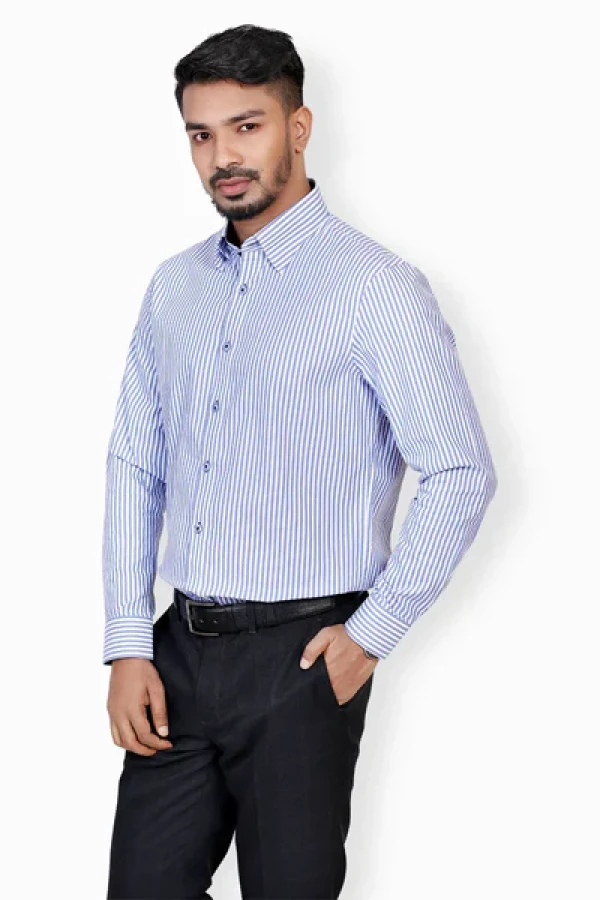 Elevate your wardrobe with our Men's Cotton Stripe Shirt. The timeless design features a classic button-down collar, long sleeves, and a sleek button placket. The refined details shine through with contrasting fabric on the inner cuffs and collar band. Crafted from premium cotton, it's comfort and style combined effortlessly. Perfect for any occasion, from casual to formal.